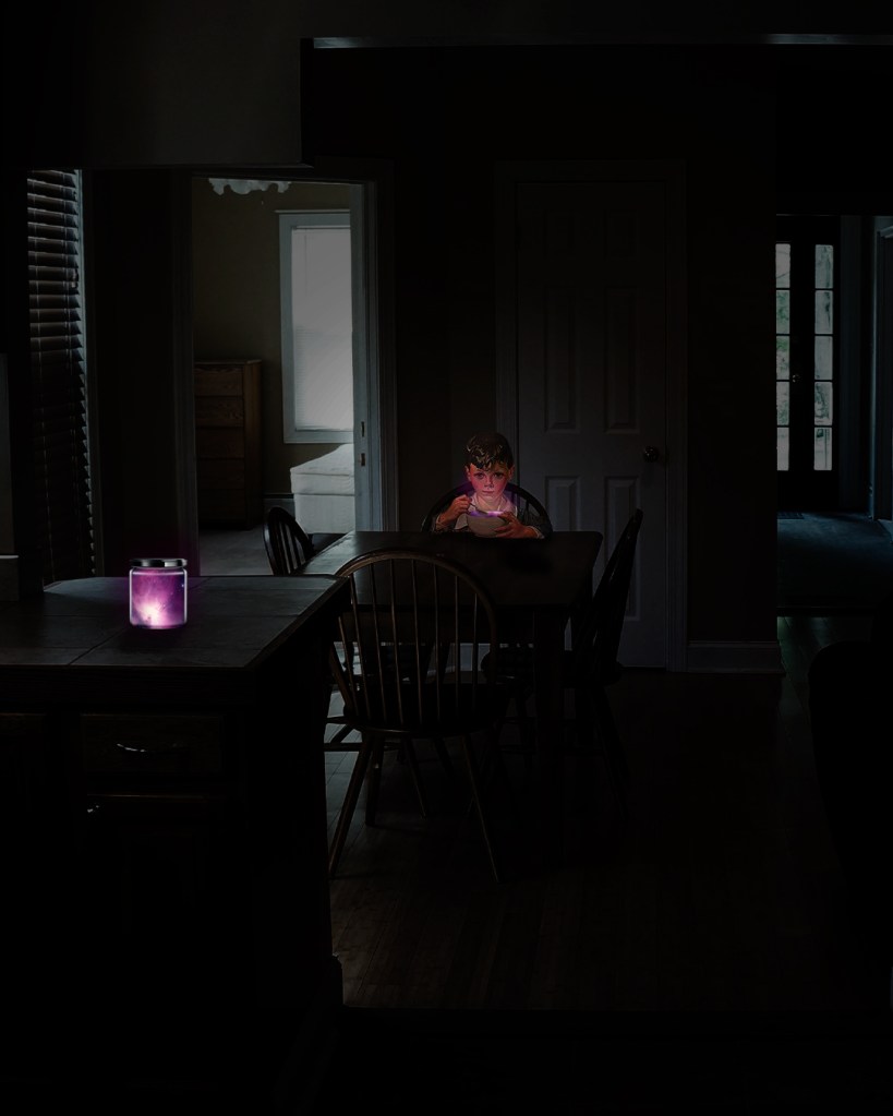 La idea de esto era revivir esos momentos de niñez donde uno quiere hacer lo contrario a lo que te dicen, representado con este niño comiendo de un frasco de extraña procedencia en horarios donde los padres no lo vean.